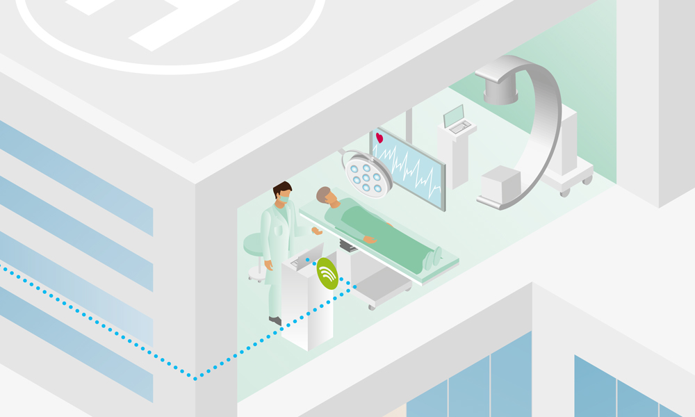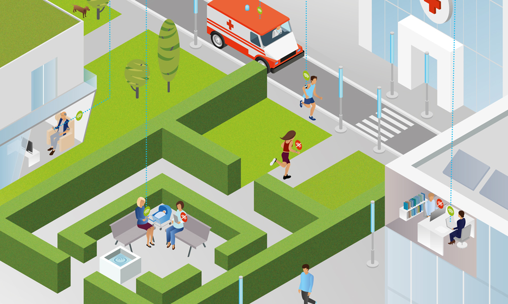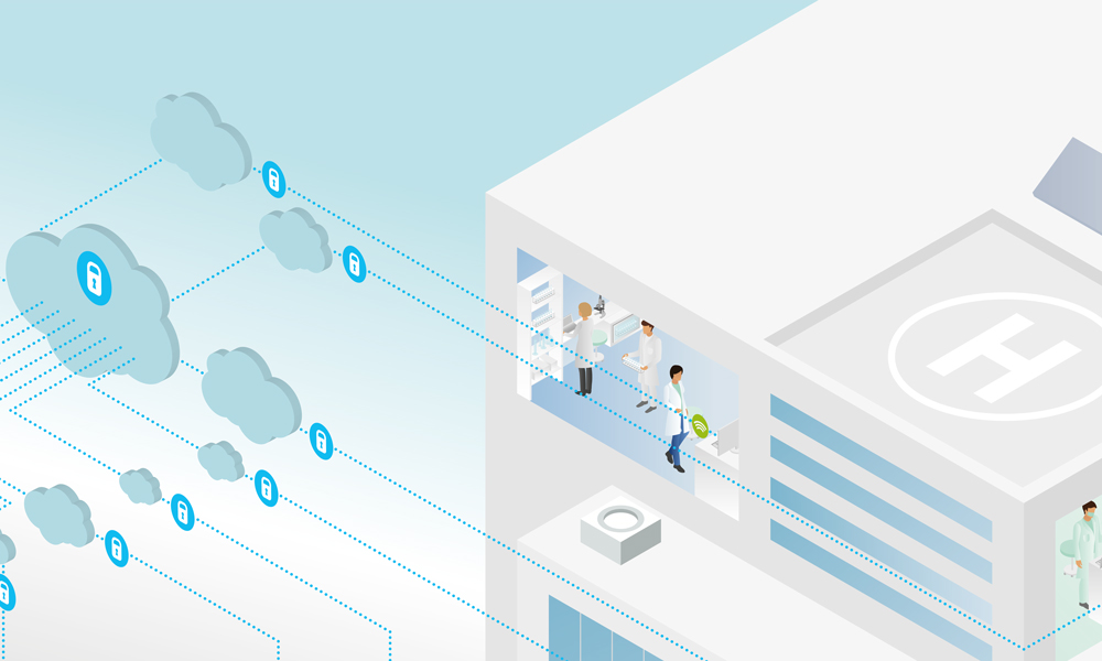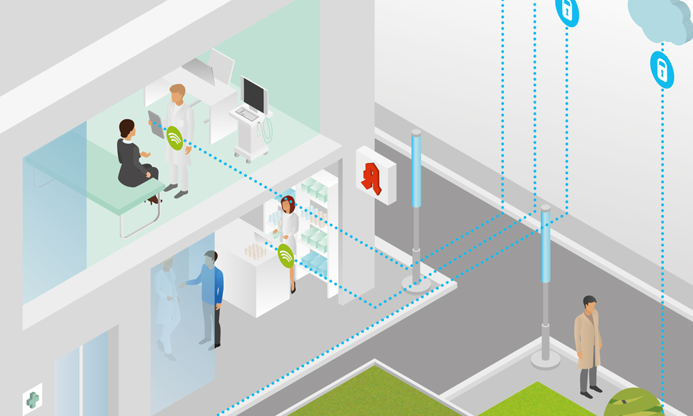 Isometrische Illustration zur Digitalisierung im Gesundheitswesen. Die Grafik wurde in verschiedenen Ausschnitten verwendet, um die Vernetzungspunkte zu erklären.
