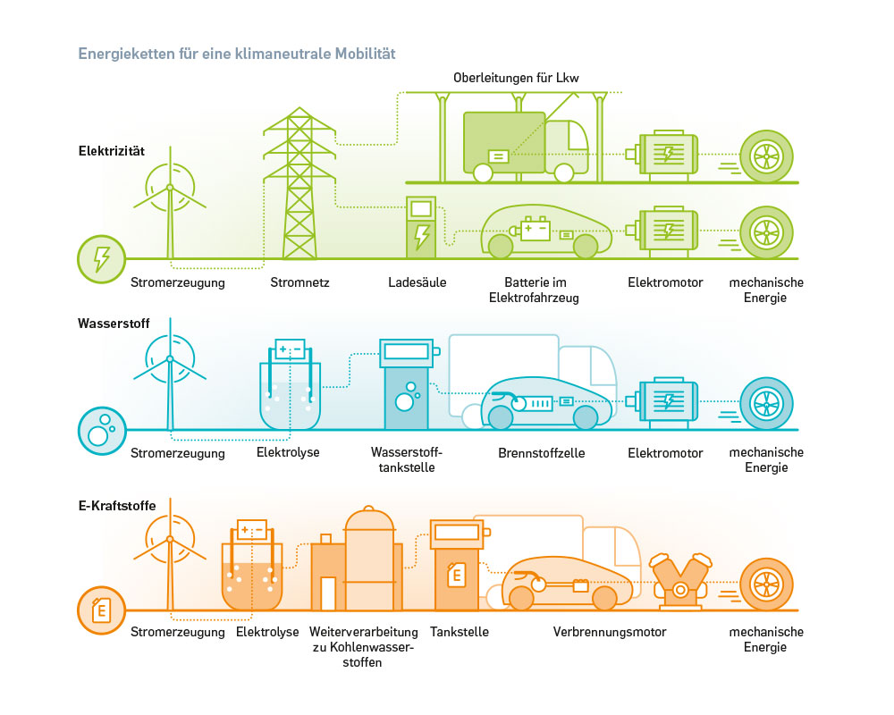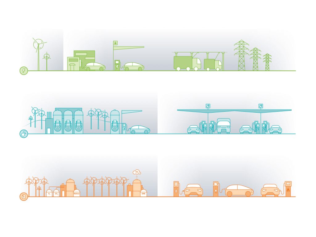Für eine Studie des FVV entstanden diese Vektor-Illustrationen: sie zeigen mögliche Energiepfade für den Straßenverkehr der Zukunft.
